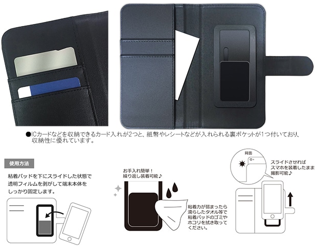 本作に登場する超高校級の才能をもつ生徒たちの象徴的なマークや意匠をモチーフに“日常生活でも使いやすい”というコンセプトでデザインされた手帳型スマホケースです。粘着パッドでスマートフォンを固定するので、幅広い機種で使用可能です。粘着パッドはスライド式のため、装着したまま写真撮影もバッチリ!