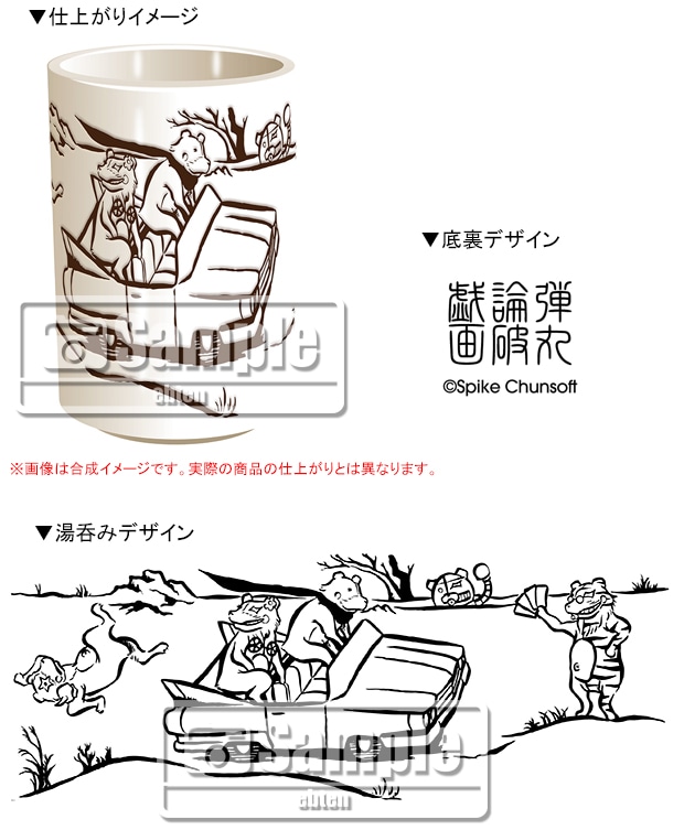 東京ゲームショウ2016の「希望ヶ峰学園購買部 TGS出張所」で話題となった“ダンガンロンパ戯画”コンセプトの描き下ろしイラストをあしらった湯呑みです。撥水技術を施した絵付けは、戯画イラストの風合いがより引き立つ、でこぼこと立体感のある仕上がりになります。