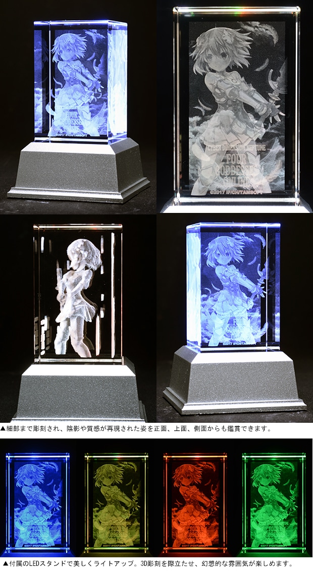 シリーズの圧倒的主人公、本作仕様の聖騎士“ネプテューヌ”をクリスタルキューブ内に3D立体レーザー彫刻で再現!付属のLEDスタンドに設置することにより、光の加減や角度によってさまざまな見え方をしますので、煌びやかで飽きのこないインテリアアイテムとして楽しめます。