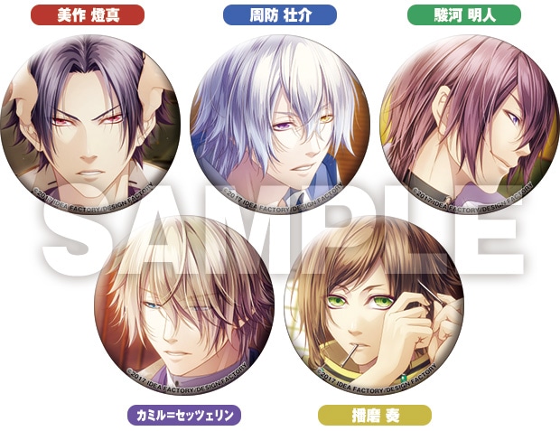 「B's-LOG 2015年9月号」に掲載させて頂いております描き下ろしから「美作 燈真」、「周防 壮介」、「駿河 明人」、「カミル=セッツェリン」、「播磨 奏」のイラストを使用した缶バッジ5種セット。