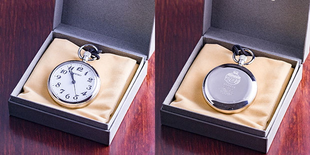 本限定モデルは、実際に運転士が使用している鉄道時計をベースに、ケース裏面と専用のBOXに「電車でGO!」20周年記念ロゴを付けた特別な逸品です。