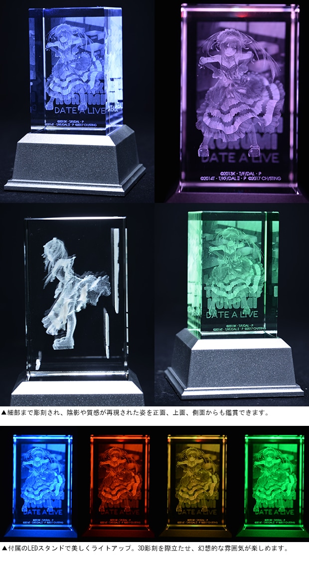 時崎狂三をクリスタルキューブ内に3D立体レーザー彫刻で再現。付属のLEDスタンドに設置することにより、光の加減や角度によってさまざま な見え方をしますので、煌びやかで飽きのこないインテリアアイテムとして楽しめます。