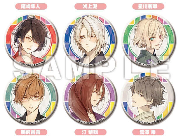 「尾崎隼人」「鴻上滉」「星川翡翠」「鵜飼昌吾」「汀 紫鶴」「鷺澤 累」の立ち絵イラストを使用した缶バッジ6種セット。