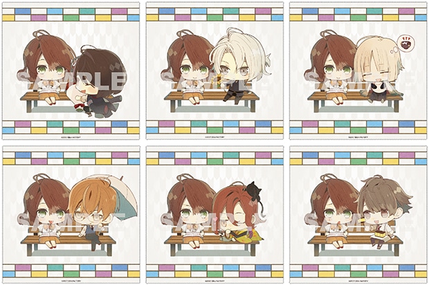 「尾崎隼人」「鴻上滉」「星川翡翠」「鵜飼昌吾」「汀 紫鶴」「鷺澤 累」のちびキャライラストを使用したマイクロファイバークロス6種セット。