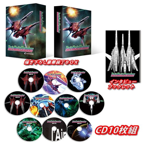 今回は、コンシューマ版、アーケード版、リミックス版、 アルバム版、そして初収録となる「レイストーム(ロケテ版)」の音源や新作のアレンジ楽曲などを完全収録いたします。
