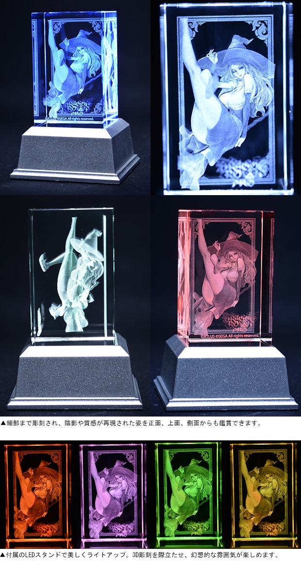 PS3版/PS Vita版『ドラゴンズクラウン』のファミ通DXパック用にヴァニラウェアにより描き下ろされたソーサレスをクリスタルキューブ内に3D立体レーザー彫刻で再現した3Dクリスタルです。付属のLEDスタンドに設置することにより、光の加減や角度によってさまざまな見え方をしますので、煌びやかで飽きのこないインテリアアイテムとして楽しめます。
