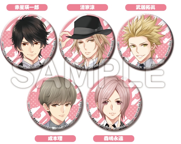 「赤星瑛一郎」「清家涼」「武居拓眞」「成本理」「森嶋永遠」の立ち絵イラストを使用した缶バッジ5種セット。