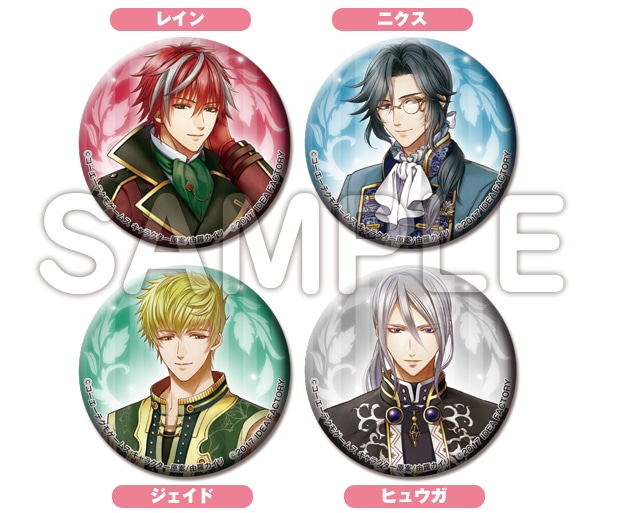 「レイン」、「ニクス」、「ジェイド」、「ヒュウガ」のイラストを使用した缶バッジ4種セット。