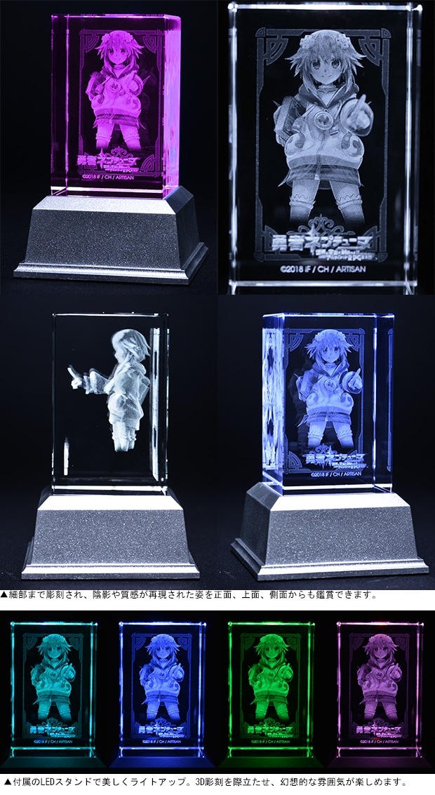 本作のキャラクターイラストをクリスタルキューブ内に3D立体レーザー彫刻で再現した3Dクリスタルです。付属のLEDスタンドに設置することにより、光の加減や角度によってさまざまな見え方をしますので、煌びやかで飽きのこないインテリアアイテムとして楽しめます。