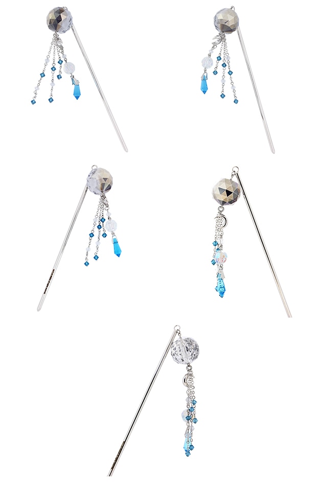 軸の先端には、ミラーボールをイメージしたビーズをあしらい、P3のイメージカラーのブルーのビーズを配しました。作品タイトルにちなんで三日月チャームをアクセントに添えています。