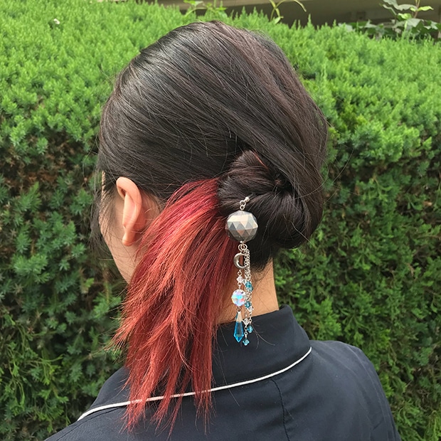 向きを気にせずに挿していただけるので、初心者の方にも扱いやすい簪です。髪の長い方でも使いやすく、1本でも髪をまとめることができます。上品な印象を与えるシルバーの軸にはロジウムコーティングを施しました。浴衣姿にはもちろん、季節を問わず洋服にも併せやすい簪です。