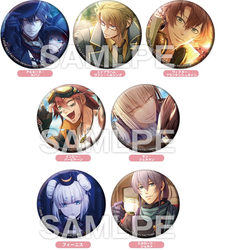 「アルセーヌ・ルパン」「エイブラハム・ヴァン・ヘルシング」「ヴィクター・フランケンシュタイン」「インピー・バービケーン」「サン・ジェルマン」「フィーニス」「エルロック・ショルメ」のイラストを使用した缶バッジ7種セット。