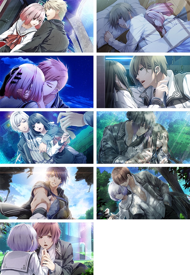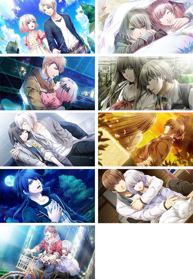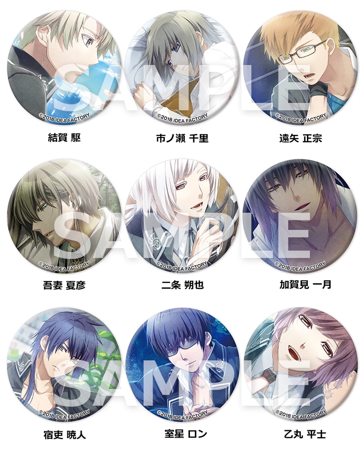 「結賀 駆」「市ノ瀬千里」「遠矢正宗」「吾妻夏彦」「二条朔也」「加賀見一月」「宿吏暁人」「室星ロン」「乙丸平士」のイラストを使用した缶バッジ9種からお好きなデザインを1つお選びください。