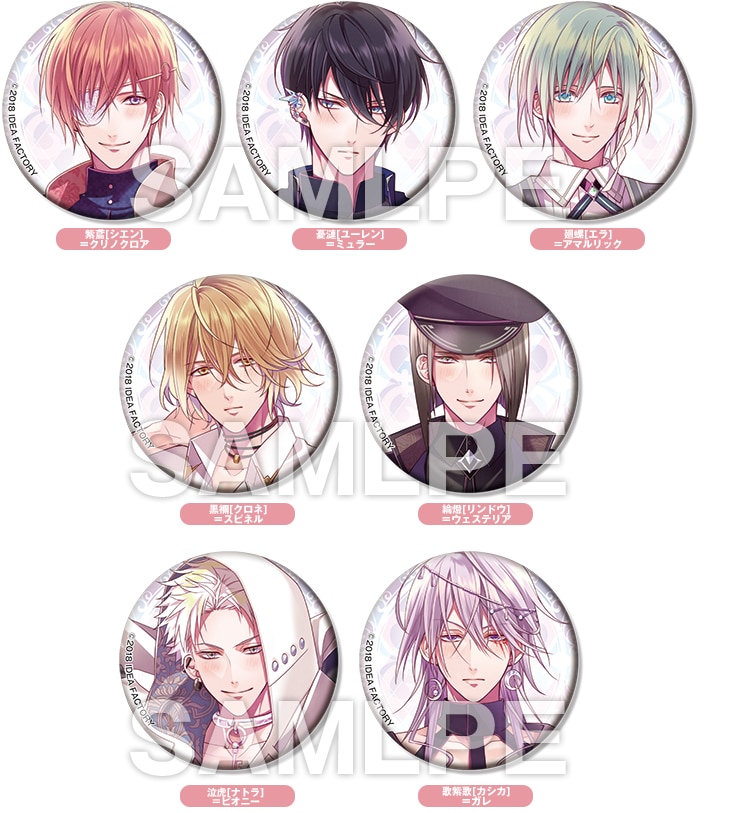 紫鳶[シエン]=クリノクロア、憂漣[ユーレン]=ミュラー、廻螺[エラ]=アマルリック、黒禰[クロネ]=スピネル、 綸燈[リンドウ]=ウェステリア、泣虎[ナトラ]=ピオニー、歌紫歌[カシカ]=ガレのイラストを使用した缶バッジ7種セット。