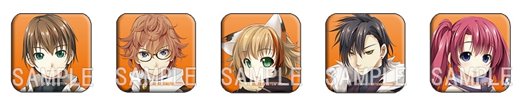 主人公である「アルト」とパーティーメンバーであるスピカ、フィー、エルリック、紫翠 のイラストを使用したスクエア型の缶バッジ5種セット