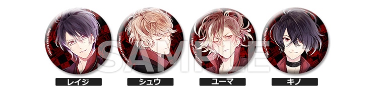 スカーレット家「レイジ」「シュウ」「ユーマ」「キノ」のイラストを使用した缶バッジ4種セット。
