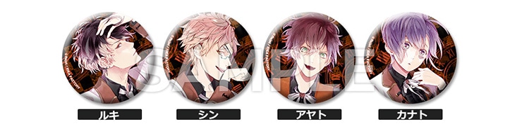 オランジュ家「ルキ」「シン」「アヤト」「カナト」のイラストを使用した缶バッジ4種セット。