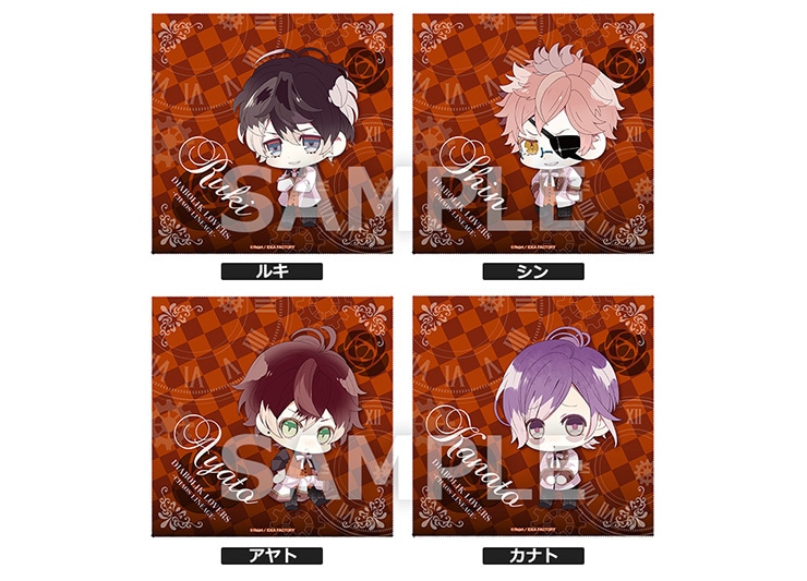 オランジュ家「ルキ」「シン」「アヤト」「カナト」のちびきゃらイラストを使用したマイクロファイバークロス4種セット。