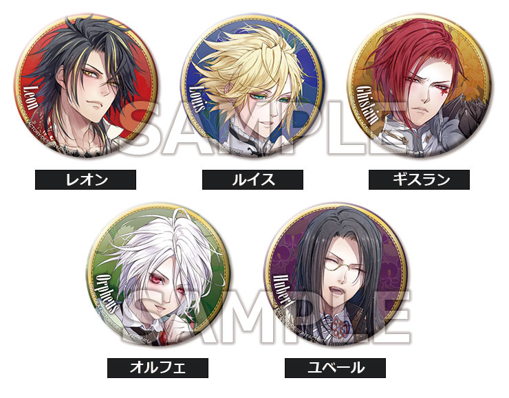 「レオン」「ルイ」「ギスラン」「オルフェ」「ユベール」のイラストを使用したオリジナル缶バッジ。