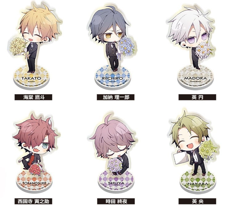 「海棠 鷹斗」「加納 理一郎」「英 円」「西園寺 寅之助」「時田 終夜」「英 央」のちびキャライラストを使用したアクリルフィギュア。並べて飾りたくなる可愛いサイズ感です♪