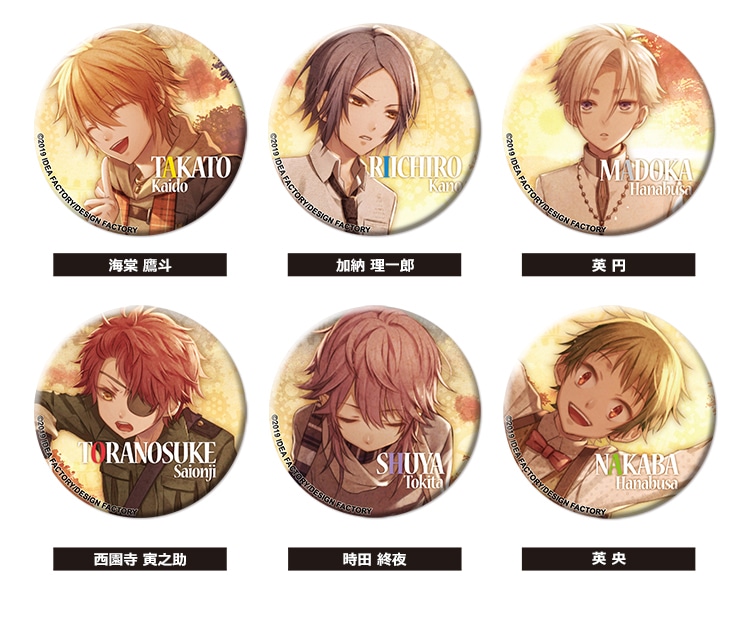 「海棠 鷹斗」「加納 理一郎」「英 円」「西園寺 寅之助」「時田 終夜」「英 央」のイラストを使用した缶バッジ6種セット。