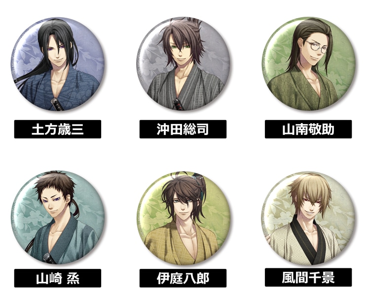 「土方歳三」「沖田総司」「山南敬助」「山崎 烝」「伊庭八郎」「 風間千景」のイラストを使用した缶バッジ6種セット。