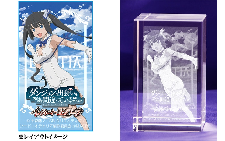 「ヘスティア・ファミリア」の主神でヒロイン“ヘスティア”のビジュアルをクリスタルキューブ内に3D立体レーザー彫刻で再現した3Dクリスタルです。