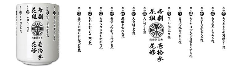 大帝国劇場楽屋に飾られた、清く、正しい乙女を育てるための規律である“花組13か条”をあしらったオリジナル湯呑みです。