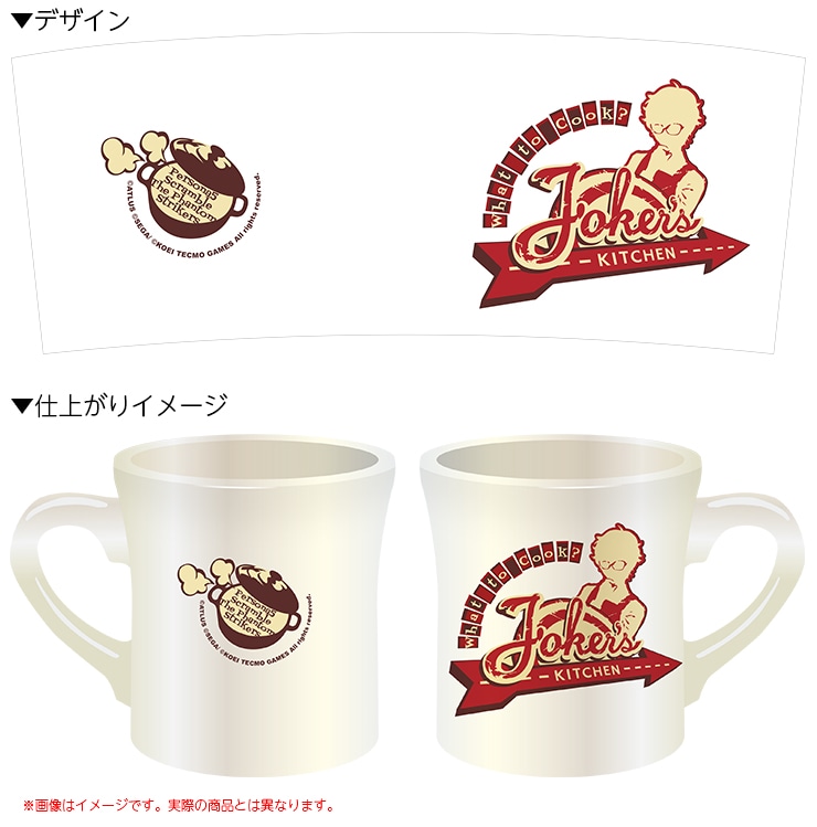 ぼってりとしたボディが特徴のダイナー風マグカップです。本作で様々な効果で怪盗団の戦いの役に立つ料理UIをモーチーフにしたオリジナルデザインです。