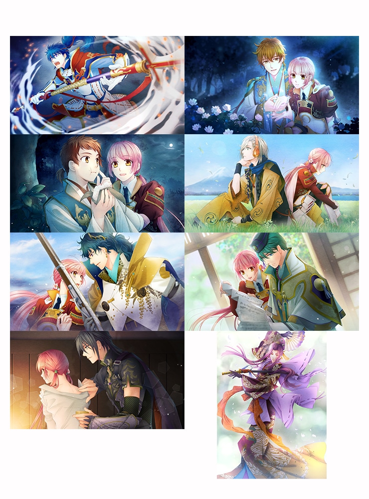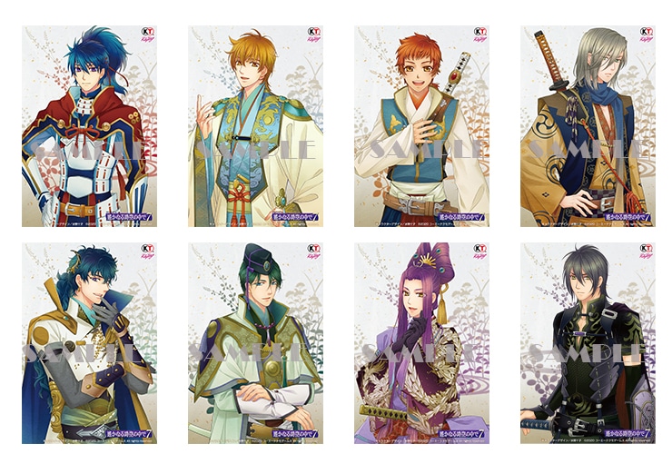 真田幸村・天野五月・宮本武蔵・佐々木大和・黒田長政・直江兼続・阿国・柳生宗矩のイラストを使用したブロマイドセット。