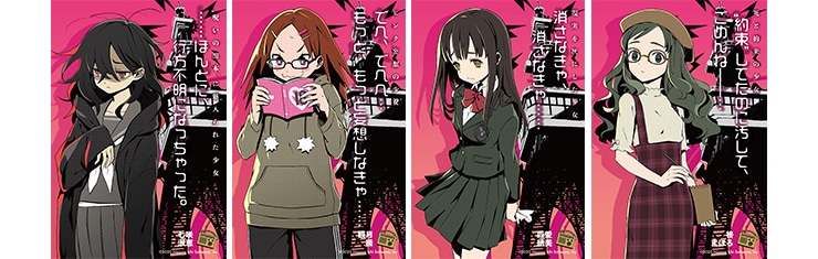 現実を灰にした少女の地獄、死と約束の少女地獄、“呪いの黒本”に魅入られた少女の地獄、ピンク妄想の少女地獄を、それぞれの主である少女たちのビジュアルとともにイメージしたブロマイドセットです。
