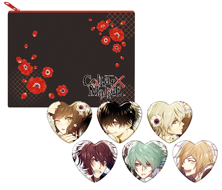 B's-LOG2018年1月号・8月号の描き下ろしイラストを使用した「Collar×Malice トレーディングハート缶バッジ」全6種と、作品をイメージしたかわいいポーチ付きのコンプリートセットです。