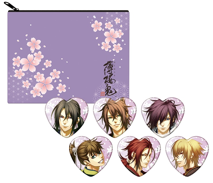 オトメイトマガジンvol.18・vol.19の描き下ろしイラストを使用した「薄桜鬼 真改 トレーディングハート缶バッジ」全6種と、作品をイメージしたかわいいポーチ付きのコンプリートセットです。