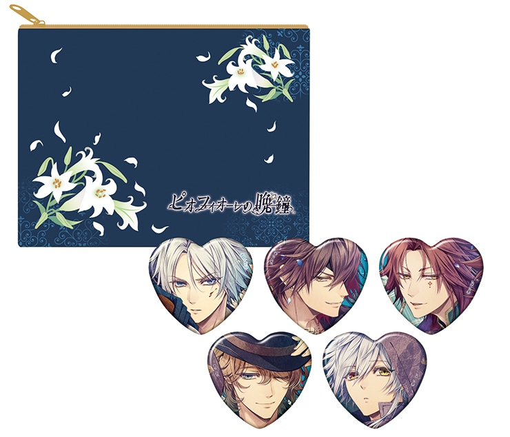 『ピオフィオーレの晩鐘』公式ビジュアルファンブックのカバーイラストを使用した「ピオフィオーレの晩鐘 トレーディングハート缶バッジ」全5種と、作品をイメージしたかわいいポーチ付きのコンプリートセットです。