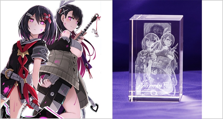 アリスとシャーロットのビジュアルをクリスタルキューブ内に3D立体レーザー彫刻で再現した3Dクリスタルです。