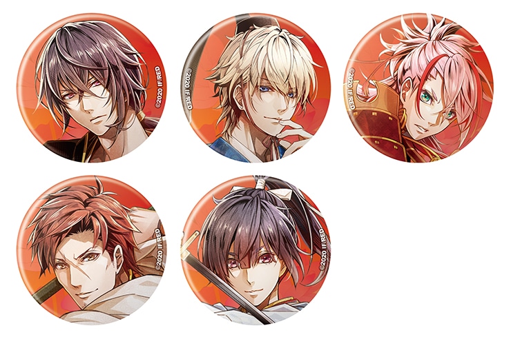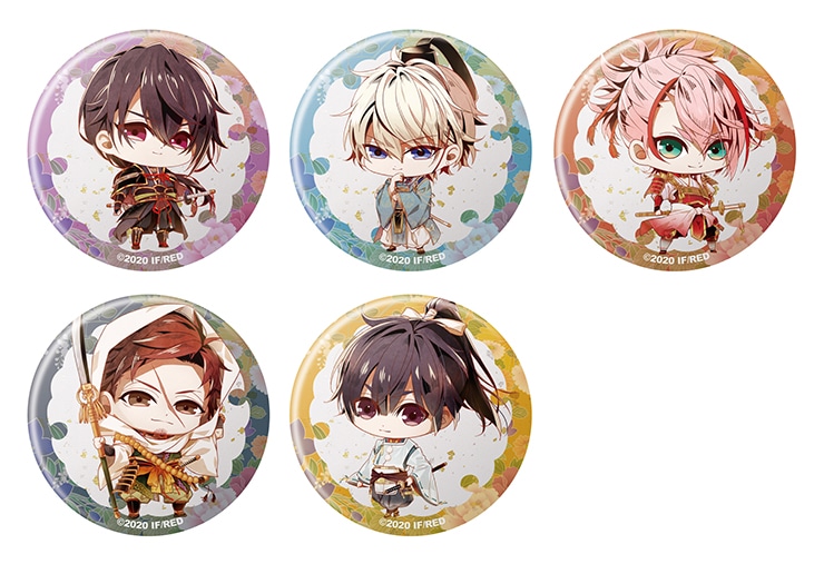 「源頼朝」「平知盛」「平教経」「武蔵坊弁慶」「春玄」のイラストを使用した缶バッジ5種セット。
