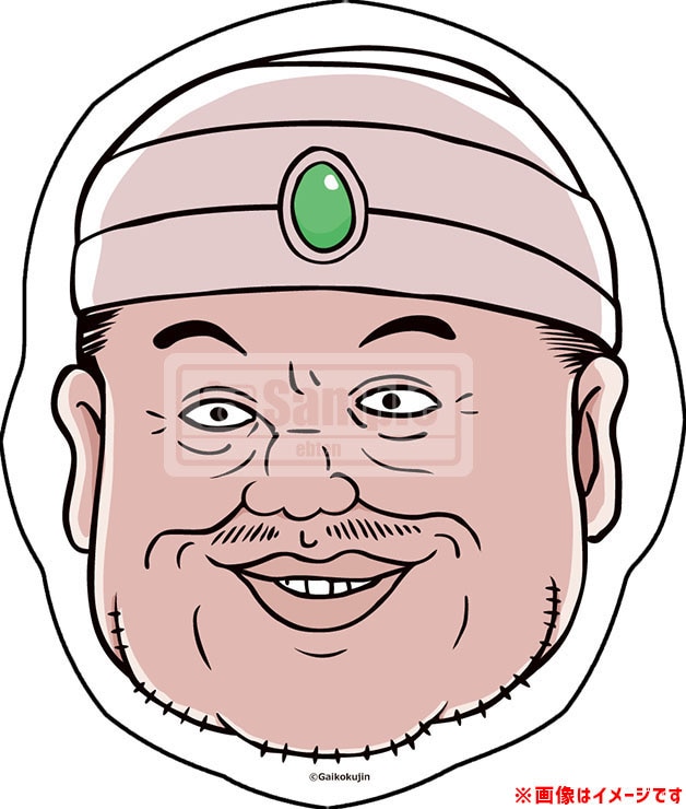 商人顔イラストが実物大にレイアウトされたクッションです。