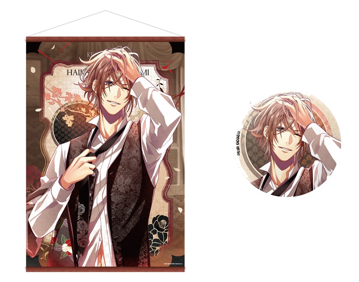 「咲村 賢」描き下ろしイラストを使用した、A2タペストリーと缶バッジ。