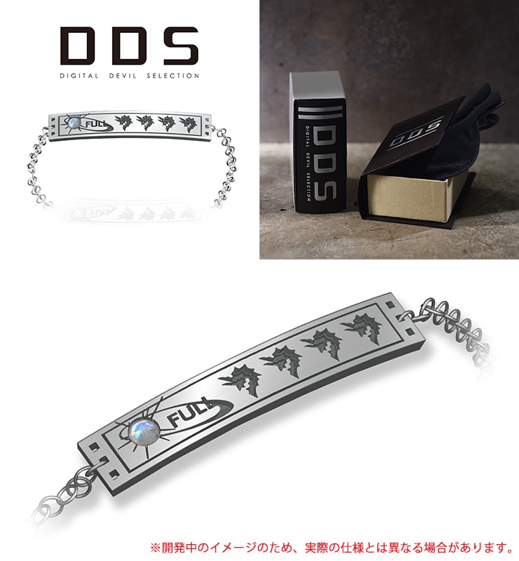 『真・女神転生』シリーズの公式ブランド「DDS」とコラボレーション。本作から導入されたバトルシステム「プレスターンバトル」のアイコンと作中で様々な要素に影響を与えるカグツチ齢を大胆にフィーチャーした、本セット限定のシルバー製のブレスレットです。カグツチ部分にはムーンストーンを用い、独特の風合いを実現。さらに、DDS特製ケースに同梱してお届けいたします。まさに“逸品”です。