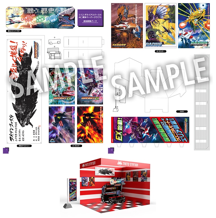 筐体ペーパークラフトの装飾用として、ダライアスバースト アナザークロニクルの店舗用のぼりや、筐体の上に置けるPOP、アイアンフォスルの魚拓などのパーツが付属します。