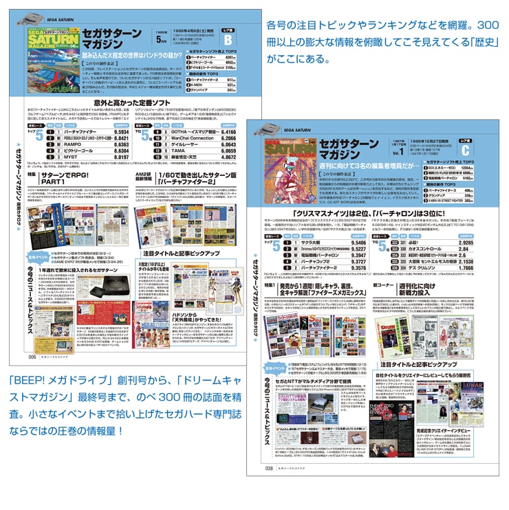 その系譜は「セガサターンマガジン」「ドリームキャストマガジン」と続き、セガハードとともに時代を駆け抜けた。近年、セガサターン25 周年、メガドライブの30 周年、ドリームキャストの20周年、そしてセガの60周年と、さまざまなアニバーサリー・イヤーが続いたことを受け、歴代セガハード専門誌の資産を再結集。節目の年を祝うにふさわしい記念書籍が発売されます。