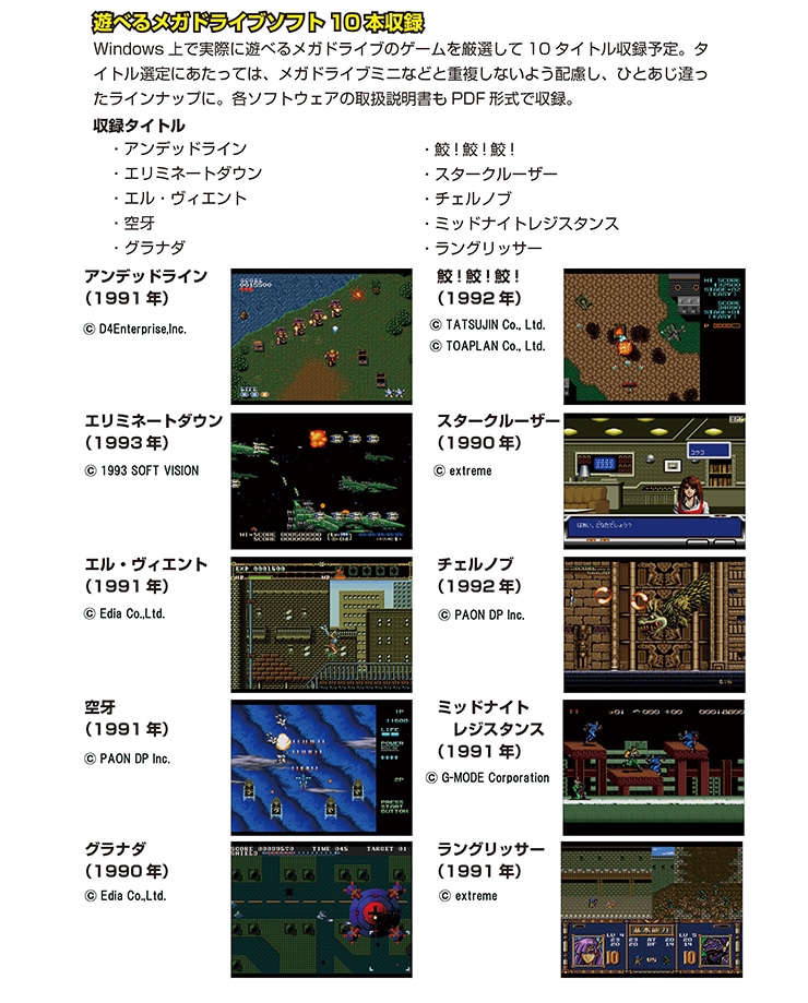 『チェルノブ』『ラングリッサー』『アンデッドライン』『スタークルーザー』ほか、Windows 上で実際に遊べるメガドライブのゲームを厳選して10 タイトル収録予定。タイトル選定にあたっては、メガドライブミニなどと重複しないよう配慮し、ひとあじ違ったラインナップに。