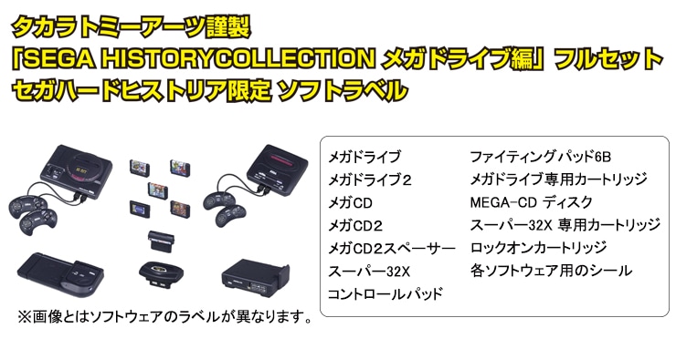 タカラトミーアーツから発売された「SEGA HISTORY COLLECTION メガドライブ編」にラインナップされた4機種すべてをセットに。ソフトカートリッジのラベルの一部は本製品ならではのオリジナル版に。