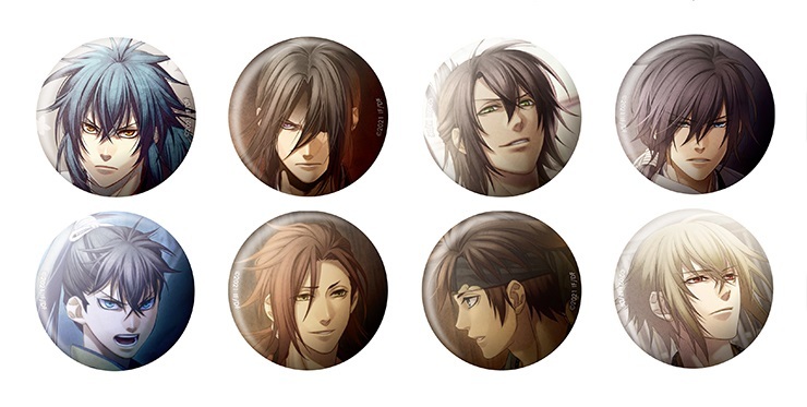「井吹 龍之介」「土方歳三」「沖田総司」「斎藤一」「藤堂平助」「原田左之助」「永倉新八」「風間千景」のイラストを使用した缶バッジ8種セット。