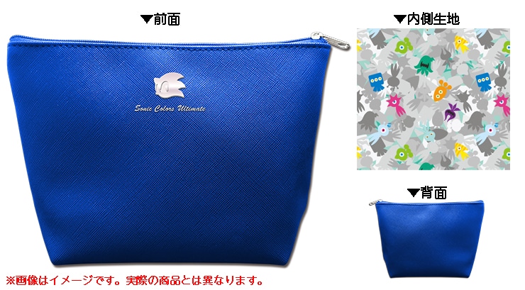 本作を“日常生活でも使いやすい”というデザインコンセプトで表現しました。表側はソニックカラーを配色した合皮を使用し、柔らかい合成レザーで扱いやすいポーチに仕上がっています。ソニックをあしらった金属パーツもワンポイントとして配置しています。内側の生地には、本作に登場するウィスプの総柄デザインが施され、ポーチを開く度に本作の世界観を楽しめます。