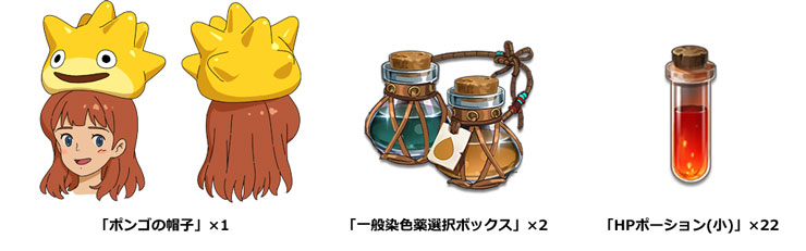 「ポンゴの帽子」×1「一般染色薬選択ボックス」×2「HPポーション(小)」×22が手に入る 『二ノ国:Cross Worlds』 ゲームアプリ特典シリアルコード
