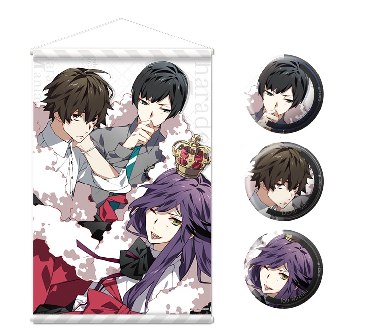 「トモセ」「メイ」「ミズキ」のA2タペストリーと缶バッジです。