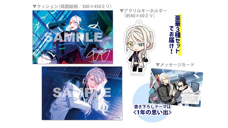 【クッション、アクリルキーホルダー、書き下ろしメッセージカード】の3種がセットになったスペシャルなアイテムです。