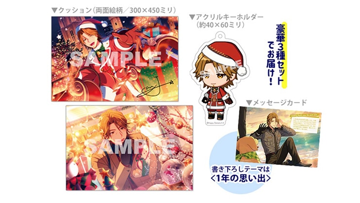 【クッション、アクリルキーホルダー、書き下ろしメッセージカード】の3種がセットになったスペシャルなアイテムです。