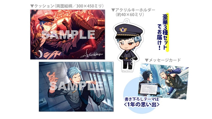【クッション、アクリルキーホルダー、書き下ろしメッセージカード】の3種がセットになったスペシャルなアイテムです。